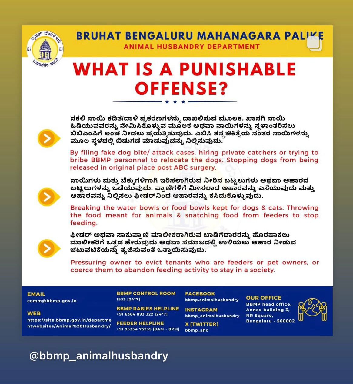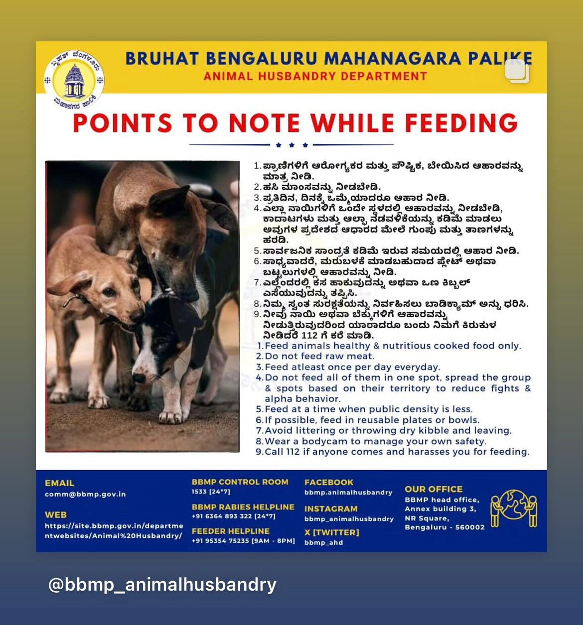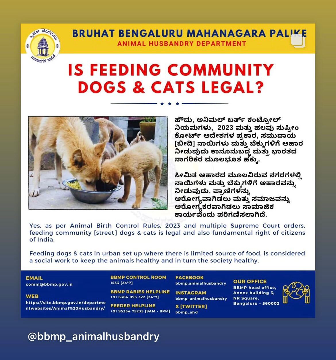 This information summary was prepared and posted by Bruhat Bengaluru Mahanagara Palike (BBMP) in May 2024, on its official Instagram handle. Note that the legal basis for these rules and guidelines are the Animal Birth Control rules 2023. The ABC-2023 rules were recognized by the Supreme Court of India as recently as Aug 2024, and are hence applicable throughout India.