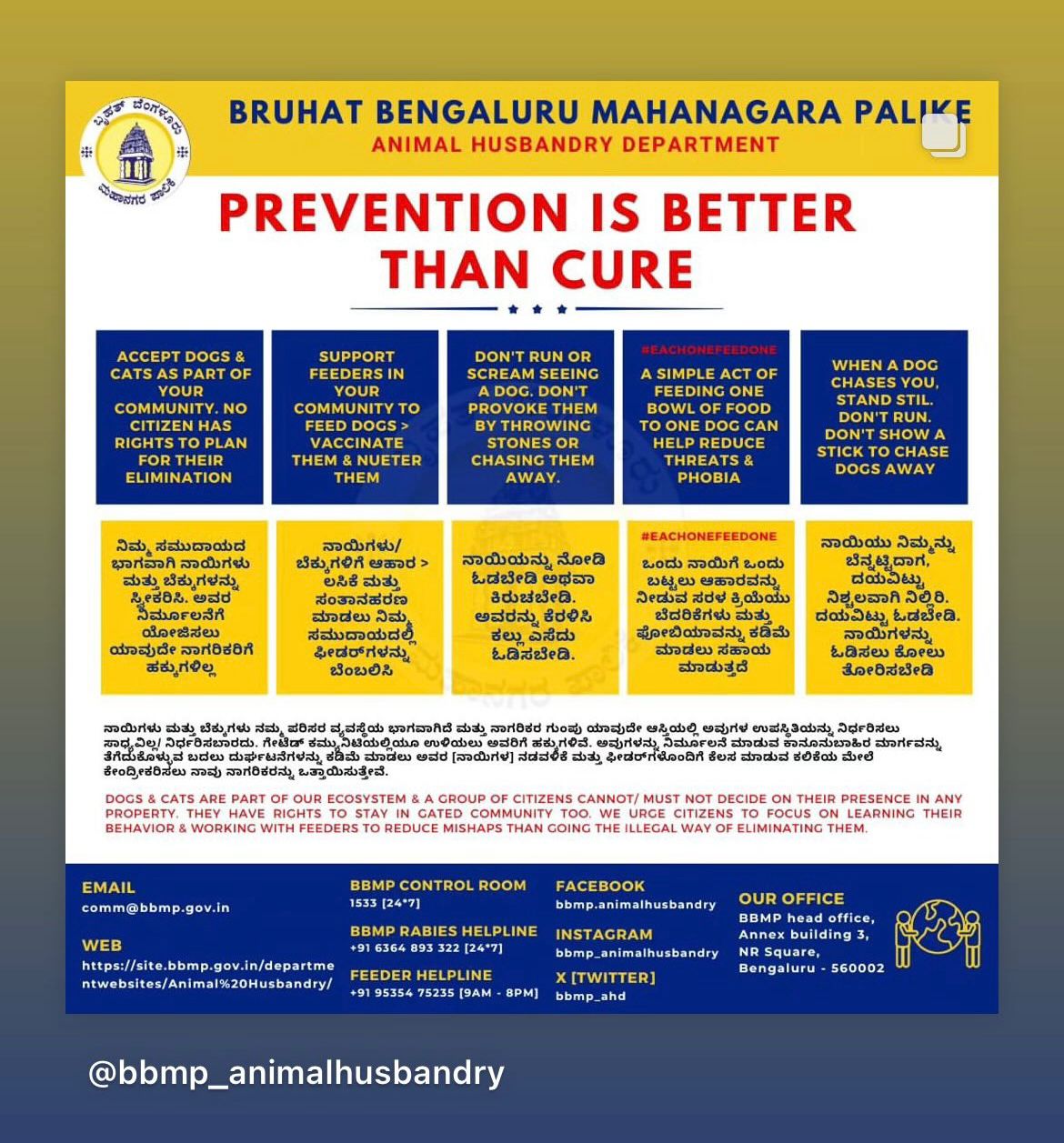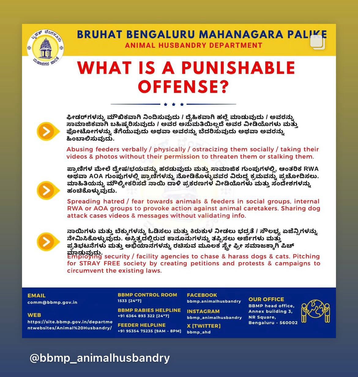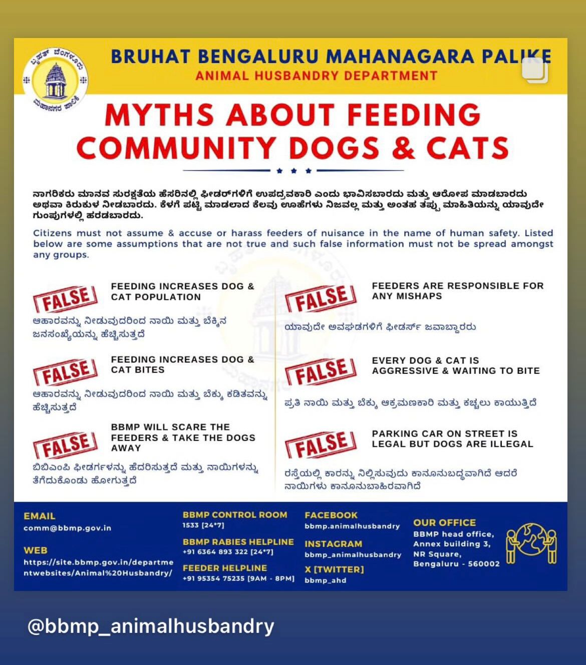 This information summary was prepared and posted by Bruhat Bengaluru Mahanagara Palike (BBMP) in May 2024, on its official Instagram handle. Note that the legal basis for these rules and guidelines are the Animal Birth Control rules 2023. The ABC-2023 rules were recognized by the Supreme Court of India as recently as Aug 2024, and are hence applicable throughout India.